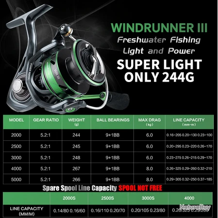 WR III 4000 Rapport d’engrenage: 5.2:1 Poids: 255g Roulements: 10BB Traînée maximale: 10KG Capacité de ligne: 0.26-325 0.29-260 0.32-210